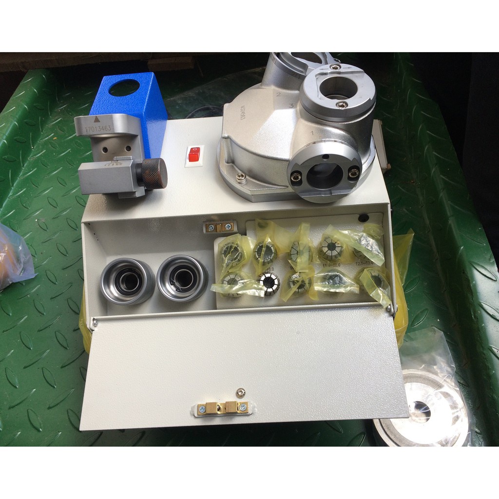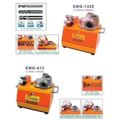Máy mài dao phay ngón EMG-413 là dòng máy sử dụng mài mũi khoan ngón loại 2 me, 3 me và 4 me. Mỗi mũi khoan sẽ tương ứng với việc chỉnh các góc 1T, 2T , 3T trên máy.